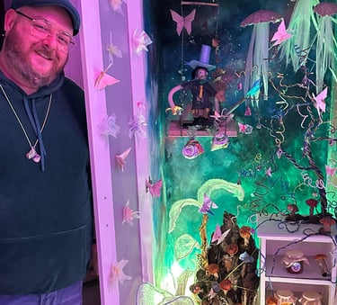 At its feet, pieces of fabric carry fragments of songs that once spoke my pain — the confusion, the loneliness, the feeling of not belonging. They tell of a time when I wanted to disappear, when being different, being a “big boy,” made me hide from the world. The kite above tells another story. Its tails are covered with words of courage and transformation — songs that helped me rediscover my voice, my beauty, and my freedom. They speak of learning to love this body, this face, this self exactly as it is. The bear holds the thread firmly, no longer ashamed, no longer trying to fit in. It stands proud and gentle, grounded yet free, reminding me that we can fly even when we carry the weight of our past — because it is the very wind that lifts us higher.