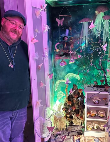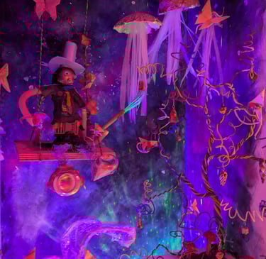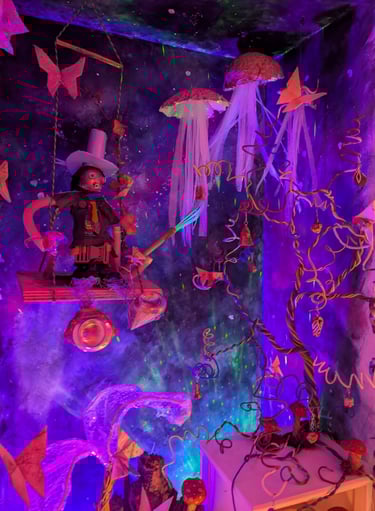 Inside the wardrobe, floating shapes, paper butterflies, vessels of pigments, sculpted branches and miniature creatures create a dreamlike ecosystem. Many materials carry the memory of their origin: the mushrooms crafted from mandarin peels, the jellyfish made from leftover packaging, the foliage created from coffee filters, the fabrics coloured with food waste. All these fragments come together to form a parallel landscape — a small universe built from what the world no longer values.